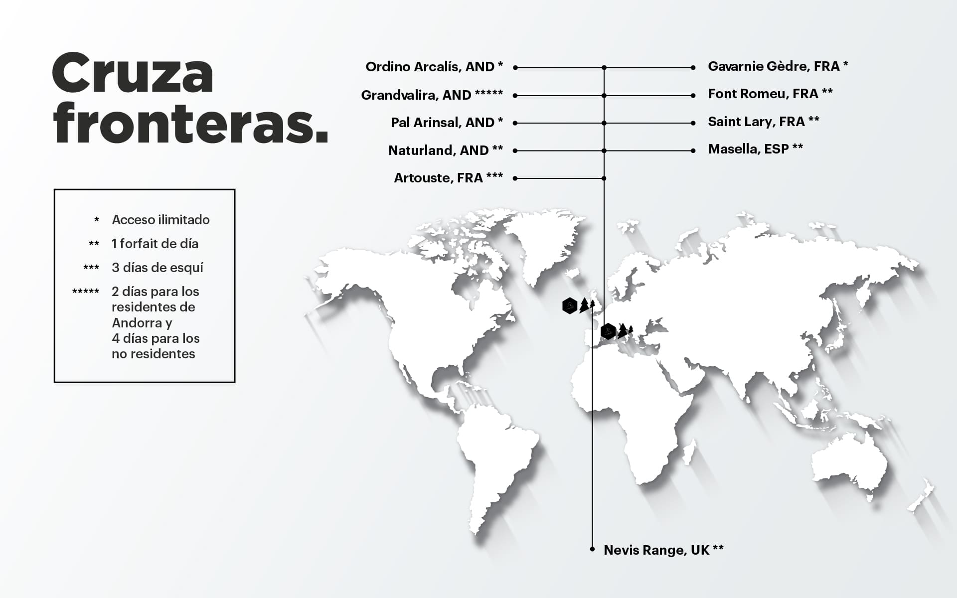 - Peatón: acceso ilimitado a los telecabinas de las estaciones de Grandvalira, Ordino Arcalís y Pal Arinsal durante el invierno y acceso a los telecabinas de las tres estaciones durante el verano 2026, así como al Bike Park de Pal Arinsal.